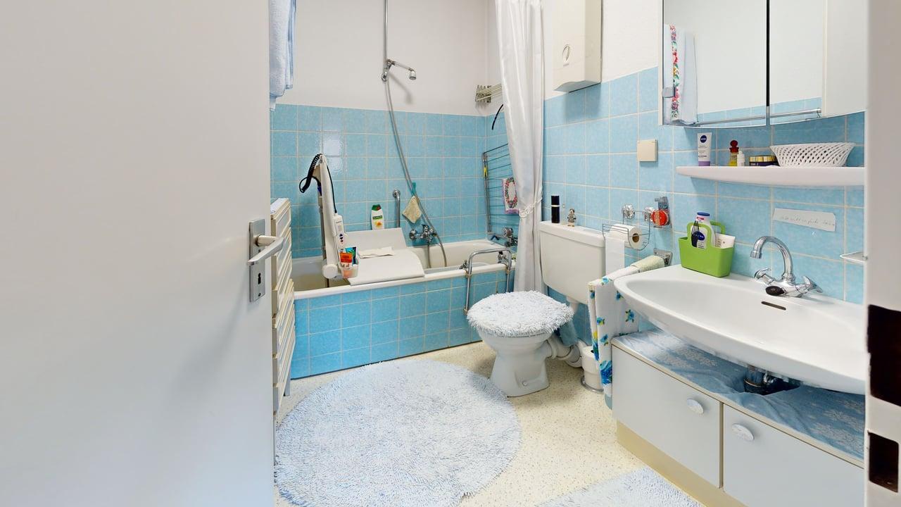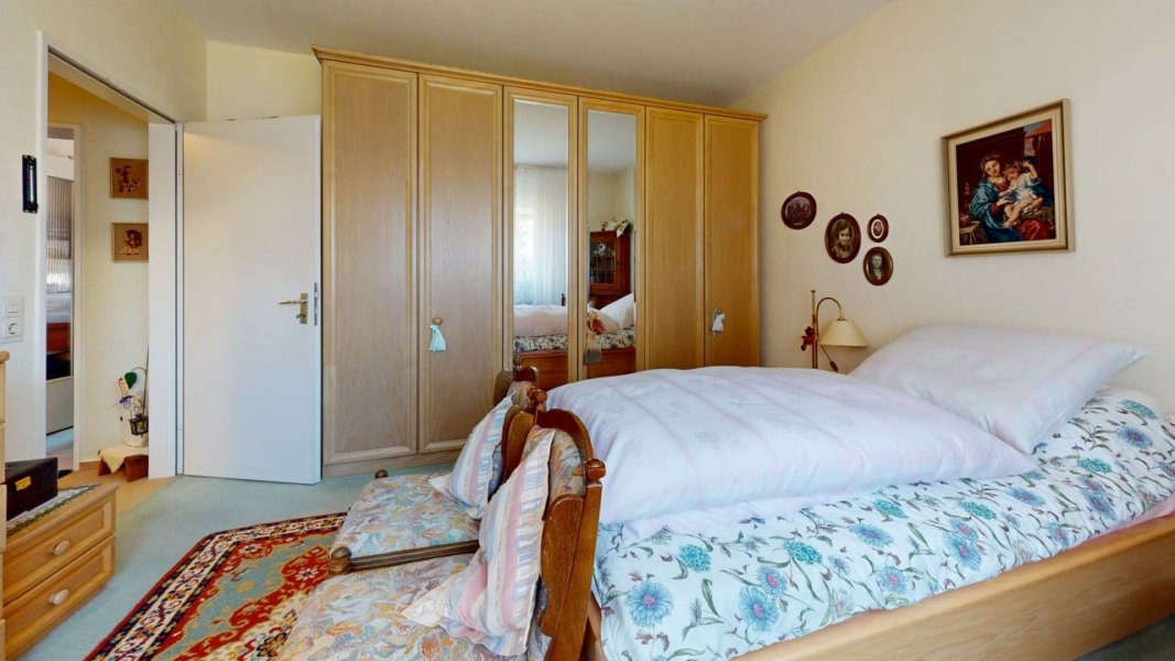Am Kopfende des Flures befindet sich das großzügige Schlafzimmer. Dieses überzeugt durch hervorragende Lichtverhältnisse und bietet ausreichend Platz für ein Doppelbett sowie einen XXL-Kleiderschrank, was den Wohnkomfort signifikant erhöht. Das Badezimmer, welches neben dem Schlafzimmer vom Flur aus zugänglich ist, lädt mit einer Badewanne zu entspannten Momenten ein. Das Herzstück der Wohnung bildet jedoch der weitläufige Wohn- und Essbereich, der durch sein helles Raumgefühl dazu einlädt, gesellige Stunden zu verbringen, und wird durch den direkten Zugang zur Loggia ergänzt.