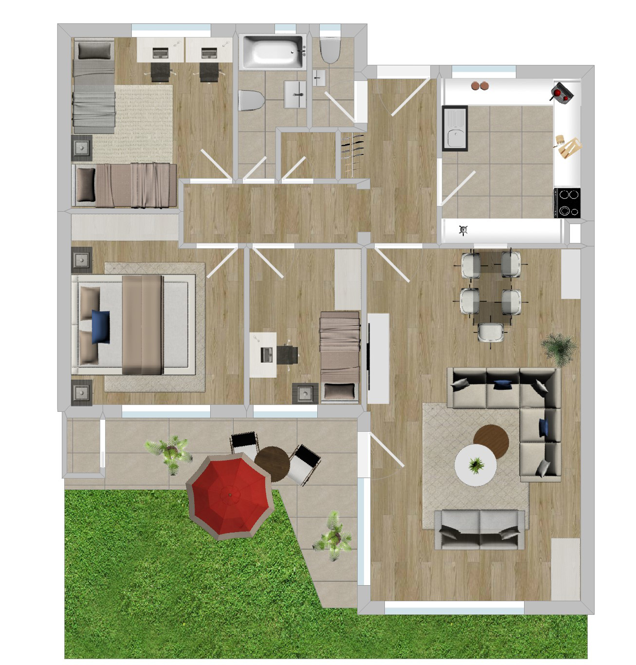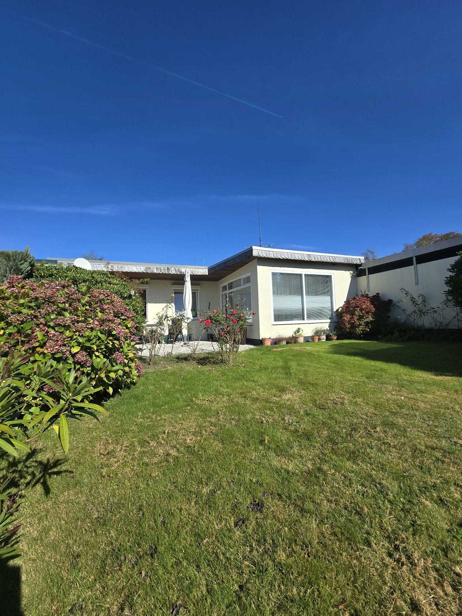 Die Außenanlagen sind ein besonderes Highlight: Ein gepflegter Vorgarten und ein weitläufiger, sorgfältig angelegter Gartenbereich mit stilvoller Terrasse laden zum Entspannen ein – eine Oase der Ruhe.