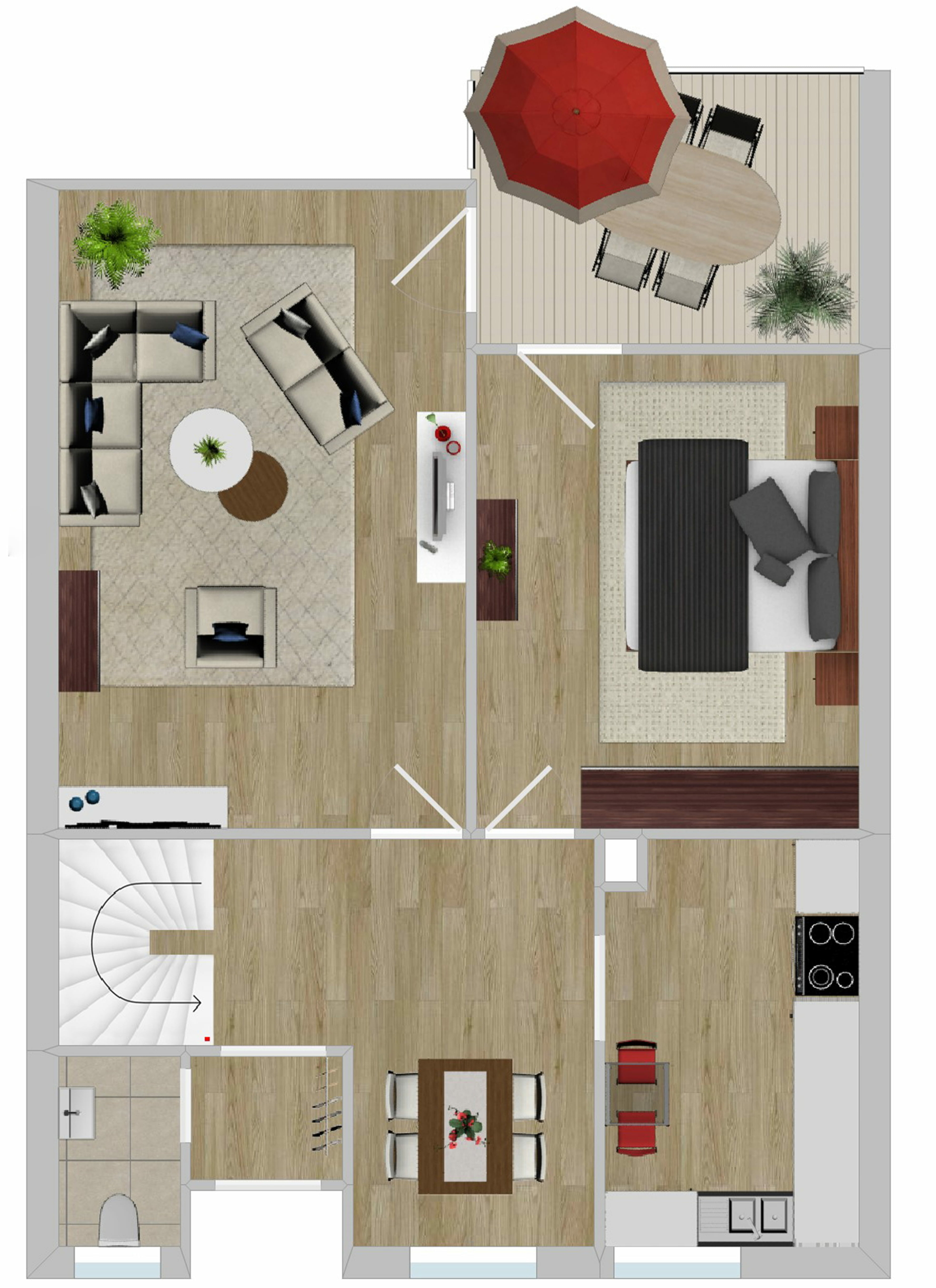 Erdgeschoss: Heller Essbereich als Herzstück, Küche, Gäste-WC sowie ein großzügiges Wohnzimmer und ein weiteres Zimmer – beide mit Zugang zum Aussichtsbalkon ins Grüne.