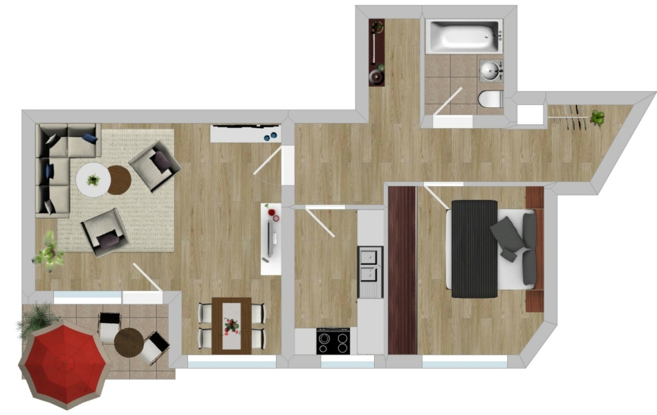 Ein besonderes Highlight ist die direkt zugängliche, eingefriedete Terrasse, die nicht nur Privatsphäre bietet, sondern auch als separater Zugang zur Wohnung dient. Der großzügige Wohnbereich eröffnet vielfältige Gestaltungsmöglichkeiten, während das gemütliche Schlafzimmer als ruhiger Rückzugsort überzeugt. Ein praktischer Abstellraum innerhalb der Wohnung sorgt für zusätzlichen Stauraum und unterstützt ein ordentliches Wohnambiente.